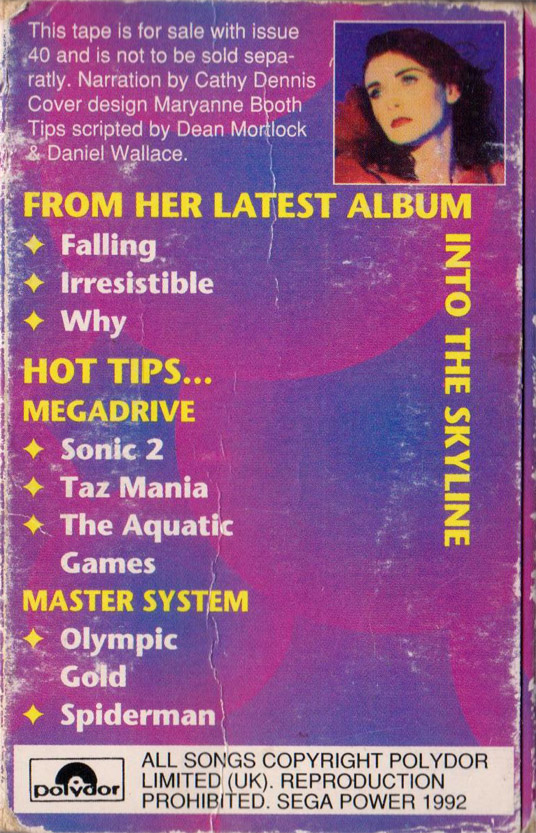 A free cassette that came with the March 1993 issue of SEGA Power magazine. While the music contained is made to promote Cathy Dennis’s album Into the Skyline, it features hints and tips for various Mega Drive and Master System titles narrated by Dennis herself.